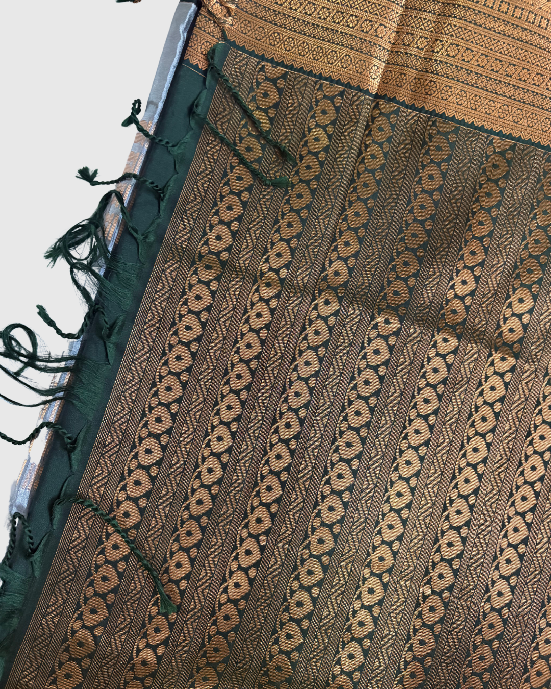 Crafted from pure silk, this saree not only offers a rich texture and luxurious drape but also ensures comfort and grace with every wear. The deep green contrast border adds a refined touch, making this ensemble truly stand out.